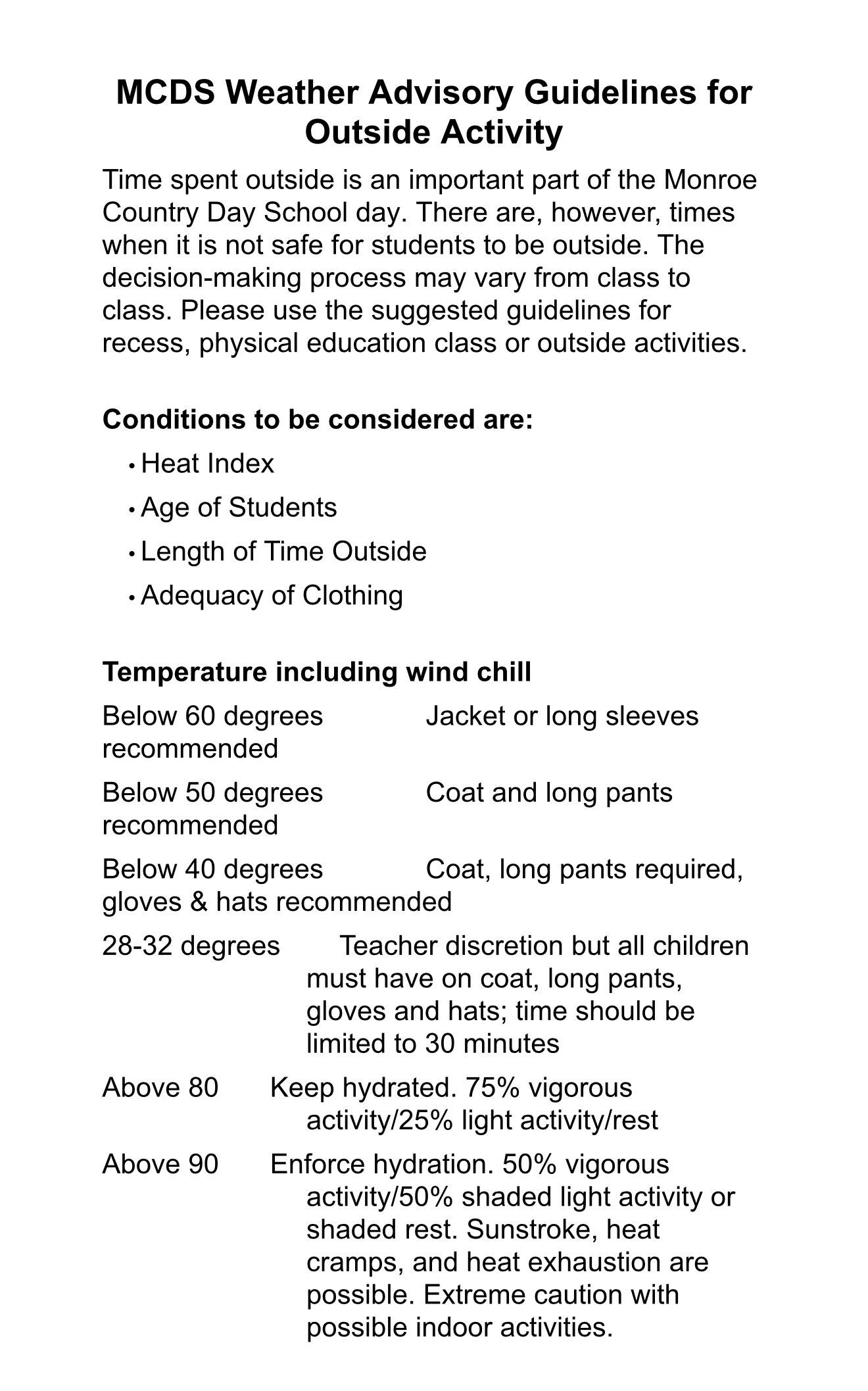 Monroe Country Day School will follow Walton County Public Schools' lead regarding delays, early dismissals, or school closures due to severe weather.