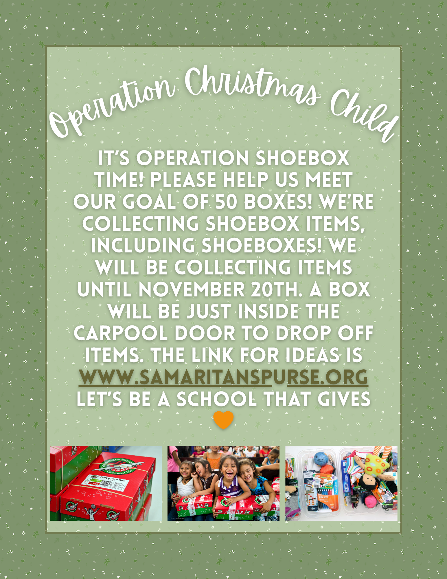 - Now-November 20th: Operation Christmas Child